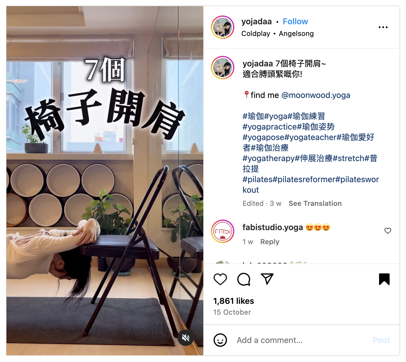 "text": "7個椅子開肩~\n適合膊頭緊嘅你!\n\n📍find me @moonwood.yoga\n\n#瑜伽#yoga#瑜伽練習#yogapractice#瑜伽姿势\n#yogapose#yogateacher#瑜伽愛好者#瑜伽治療\n#yogatherapy#伸展治療#stretch#普拉提\n#pilates#pilatesreformer#pilatesworkout",