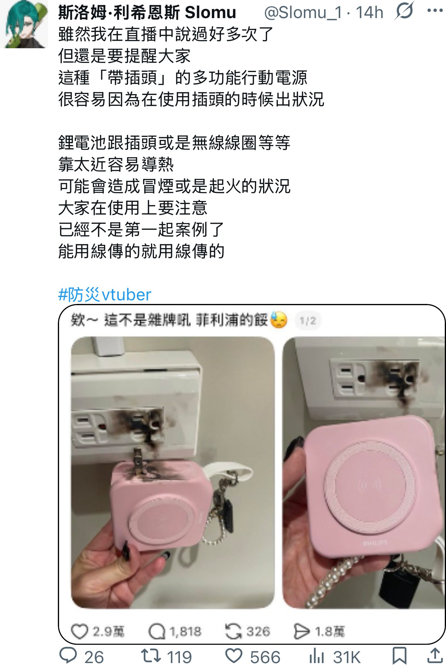 "text": "雖然我在直播中說過好多次了\n但還是要提醒大家\n這種「帶插頭」的多功能行動電源\n很容易因為在使用插頭的時候出狀況\n\n鋰電池跟插頭或是無線線圈等等\n靠太近容易導熱\n可能會造成冒煙或是起火的狀況\n大家在使用上要注意\n已經不是第一起案例了\n能用線傳的就用線傳的\n\n#防災vtuber",