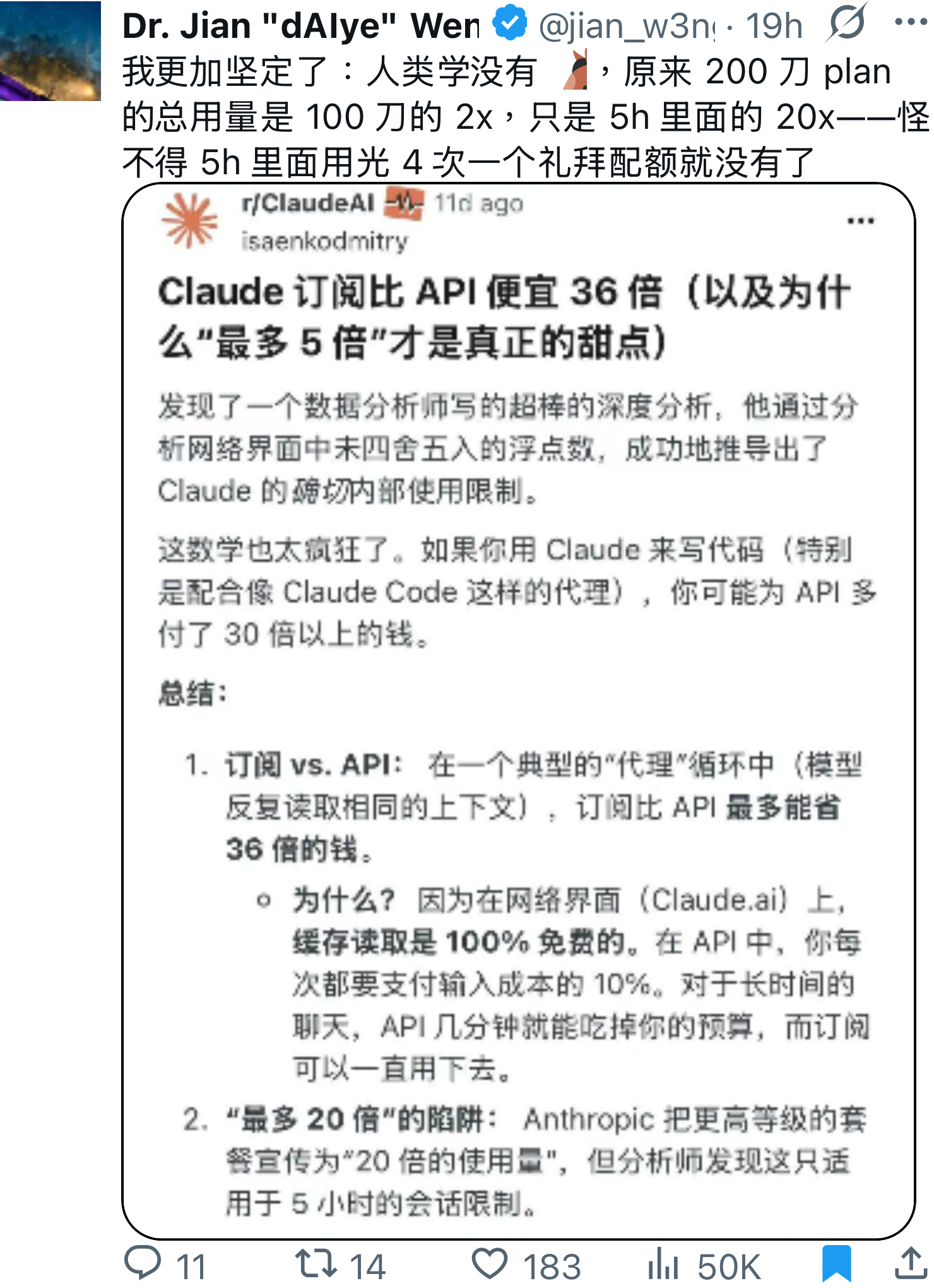 "title": "jian_w3ng: 我更加坚定了:人类学没有,原来 200 刀 plan 的总用量是 100 刀的 2x,只是 5h 里面的 20x——怪不",