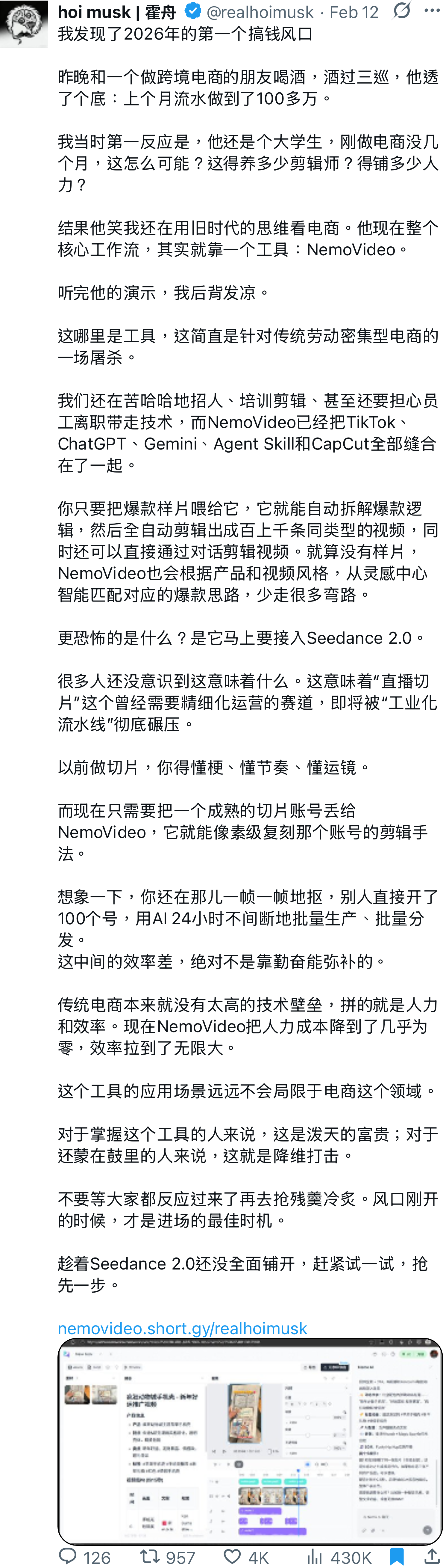 传统电商本来就没有太高的技术壁垒,拼的就是人力和效率。现在NemoVideo把人力成本降到了几乎为零,效率拉到了无限大。