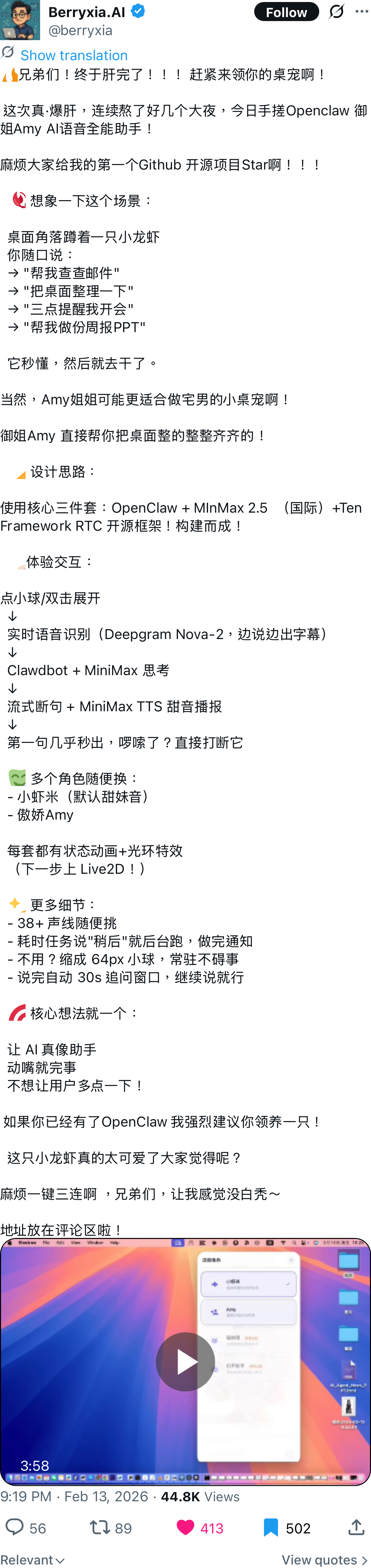 使用核心三件套:OpenClaw + MInMax 2.5 (国际)+Ten Framework RTC 开源框架!构建而成!