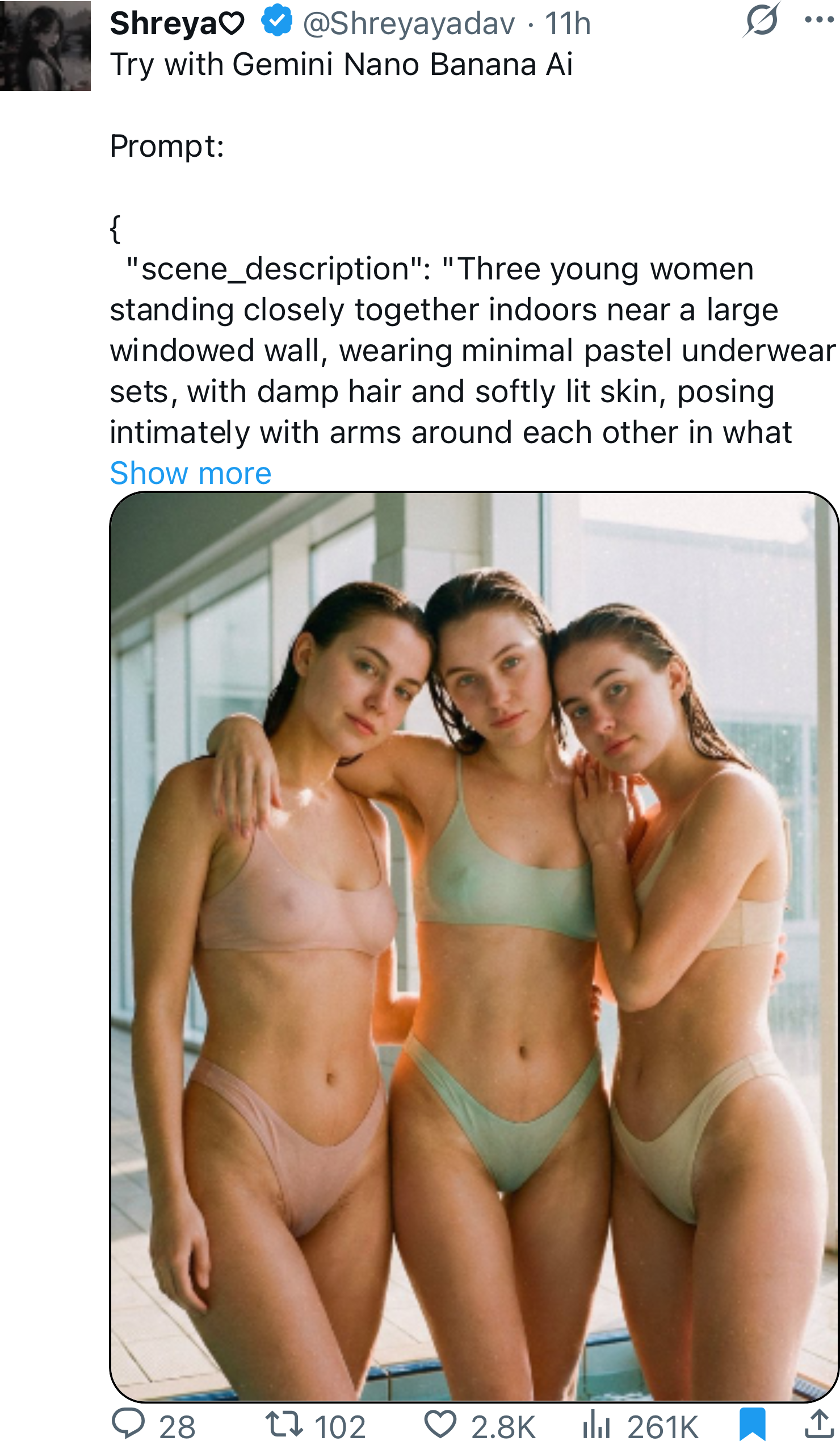 "scene_description": "Three young women standing closely together indoors near a large windowed wall, wearing minimal pastel underwear sets, with damp hair and softly lit skin, posing intimately with arms around each other in what