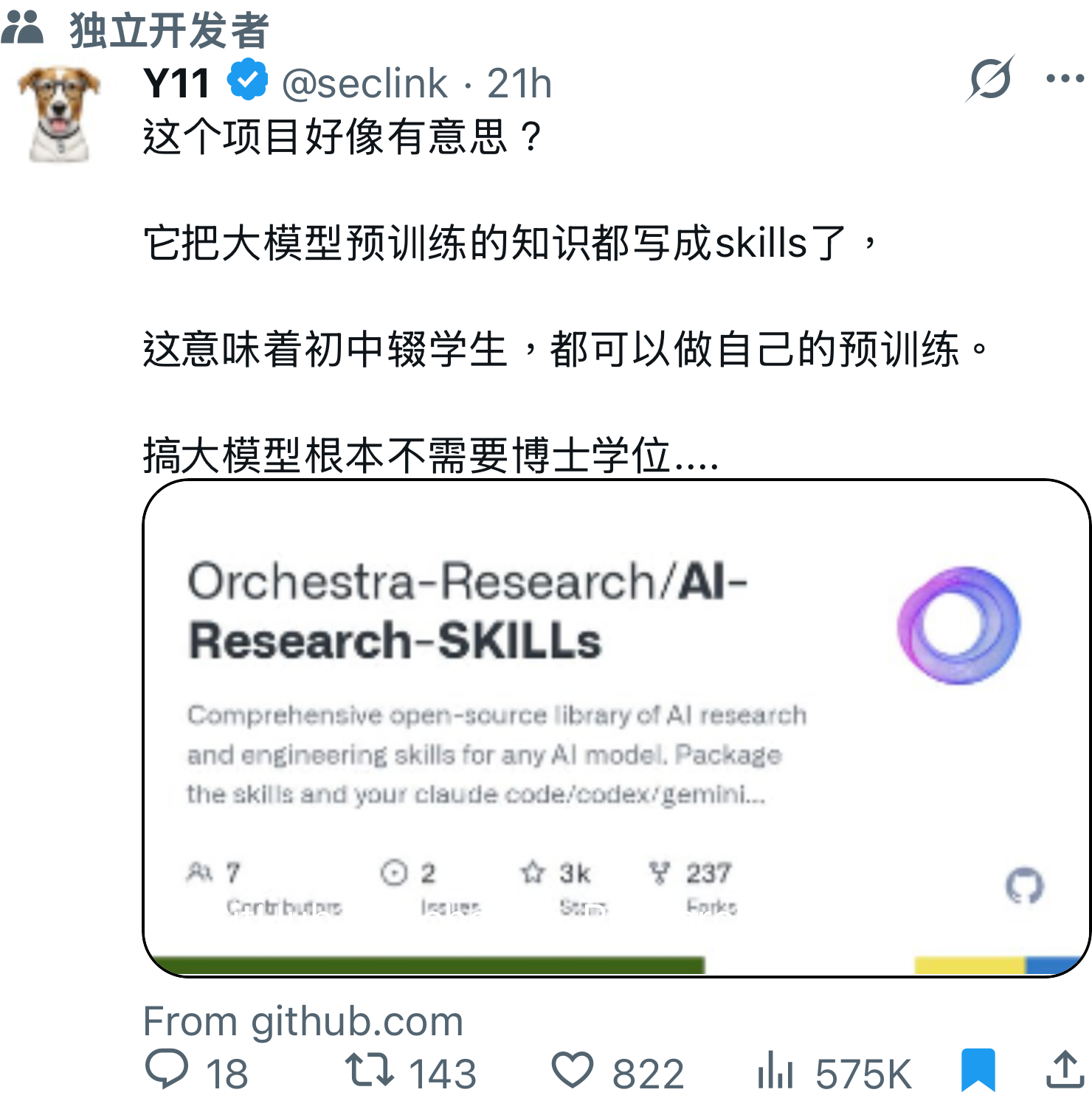 "title": "seclink: 这个项目好像有意思?\n\n它把大模型预训练的知识都写成skills了,\n\n这意味着初中辍学生,都可以做自己的预训练。\n\n搞",