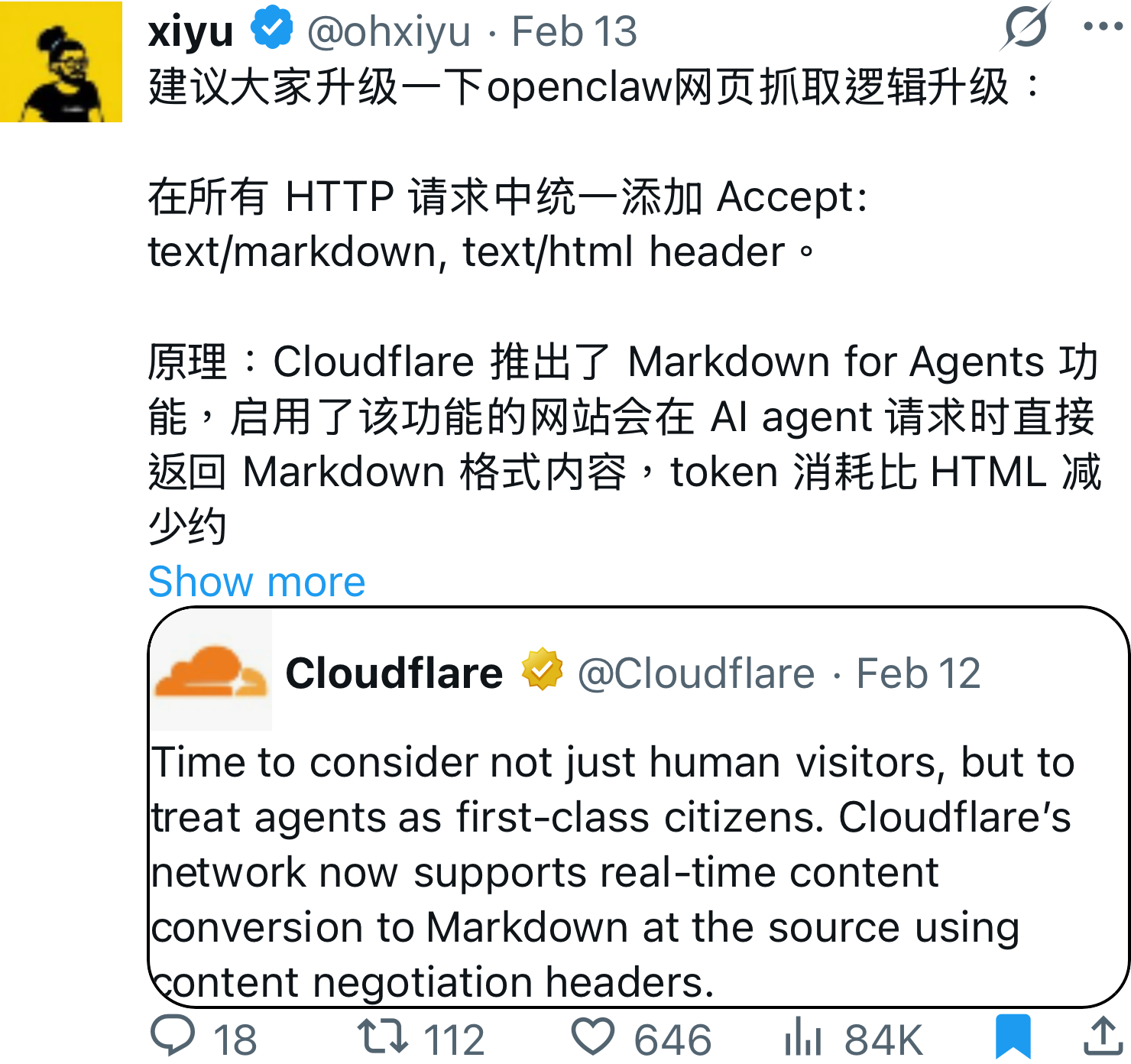 原理:Cloudflare 推出了 Markdown for Agents 功能,启用了该功能的网站会在 AI agent 请求时直接返回 Markdown 格式内容,token 消耗比 HTML 减少约