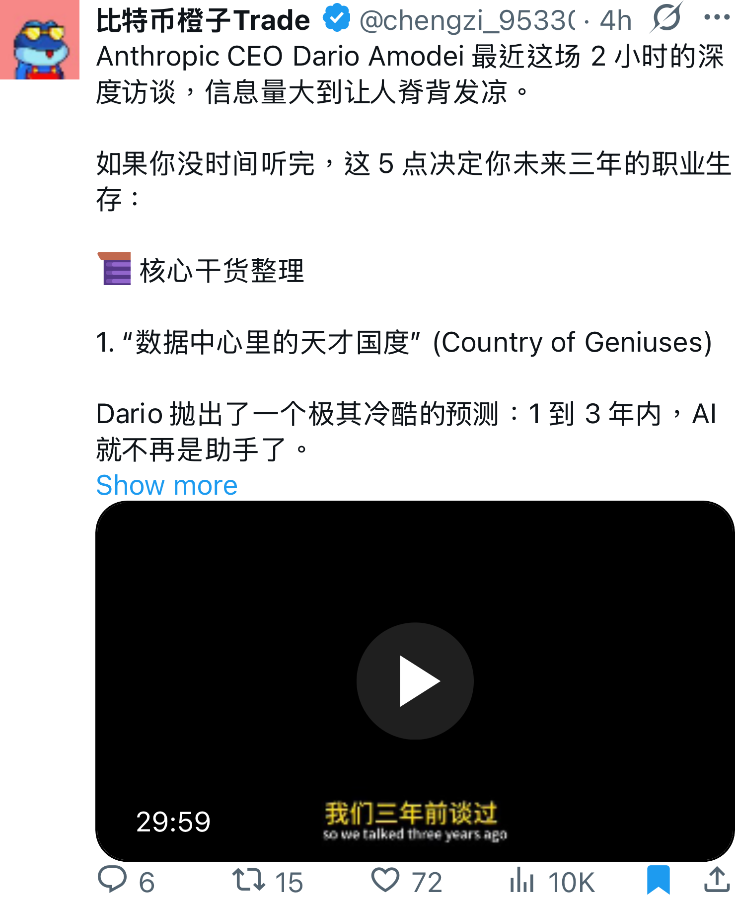 "title": "chengzi_95330: Anthropic CEO Dario Amodei 最近这场 2 小时的深度访谈,信息量大到让人脊背发凉。\n\n如果你没",