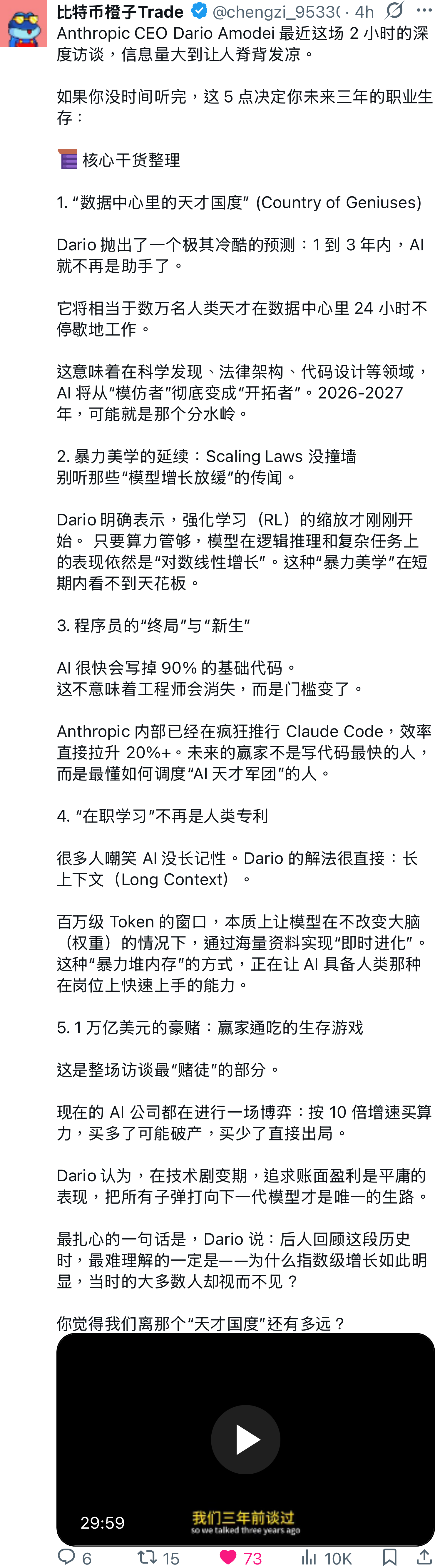 Anthropic CEO Dario Amodei 最近这场 2 小时的深度访谈,信息量大到让人脊背发凉。