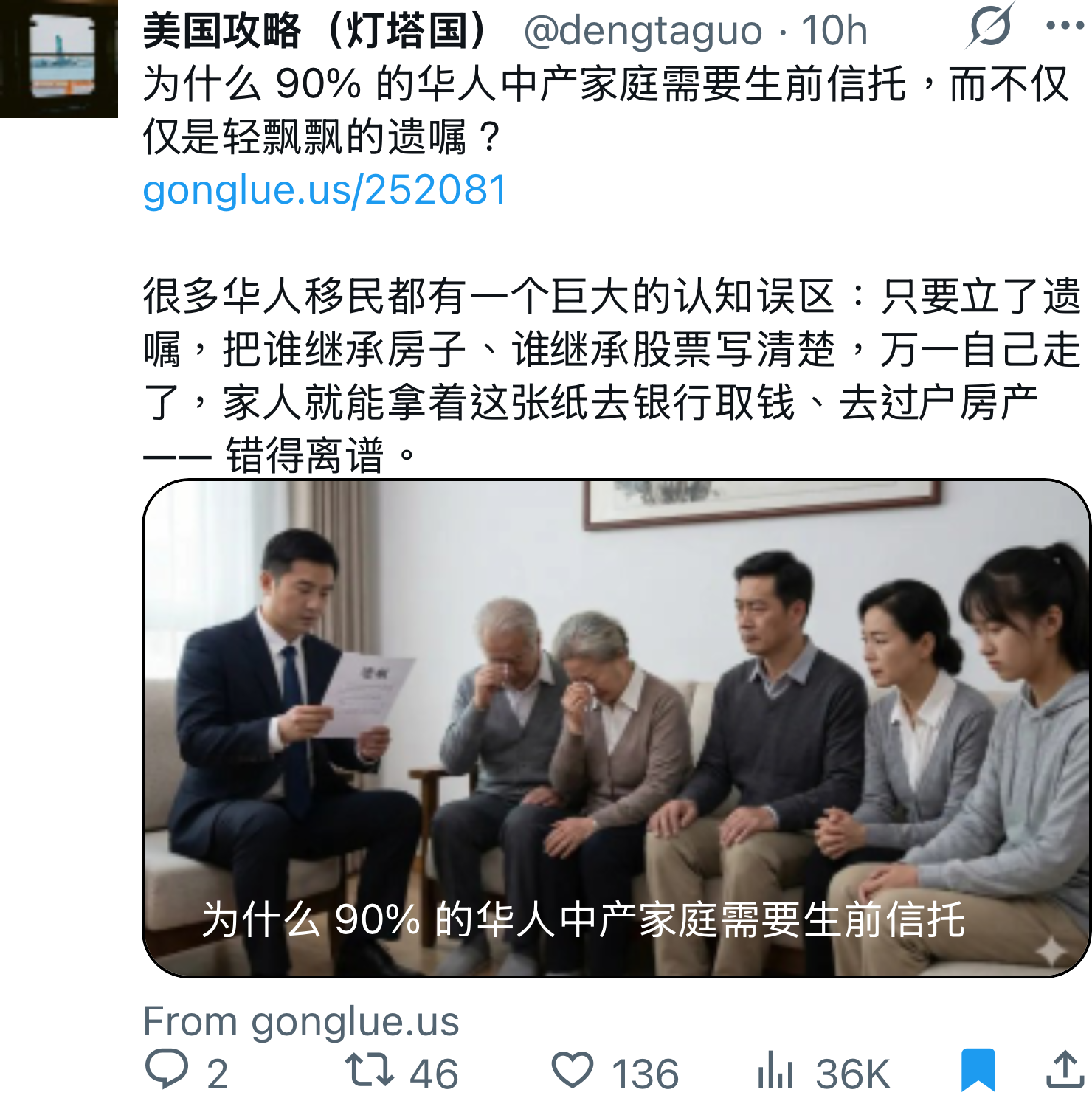 "title": "dengtaguo: 为什么 90% 的华人中产家庭需要生前信托,而不仅仅是轻飘飘的遗嘱?\nhttps://gonglue.us/252081",