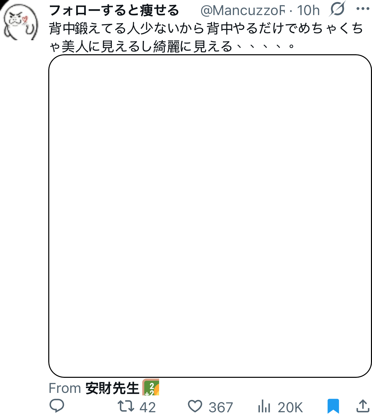 "title": "MancuzzoRoberta: 背中鍛えてる人少ないから背中やるだけでめちゃくちゃ美人に見えるし綺麗に見える、、、、。",