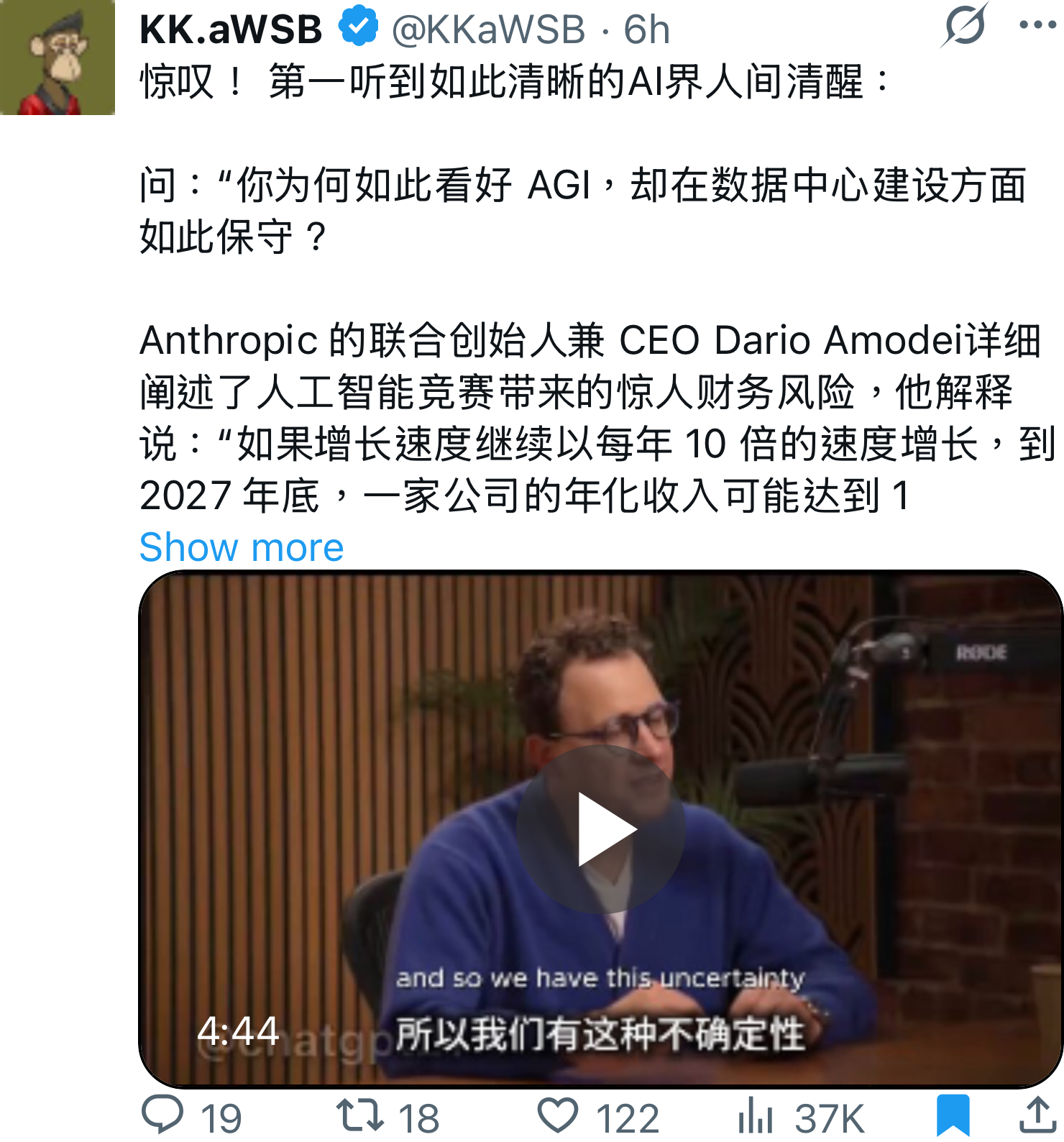 "title": "KKaWSB: 惊叹! 第一听到如此清晰的AI界人间清醒:\n\n问:“你为何如此看好 AGI,却在数据中心建设方面如此保守?\n\nAnthr",