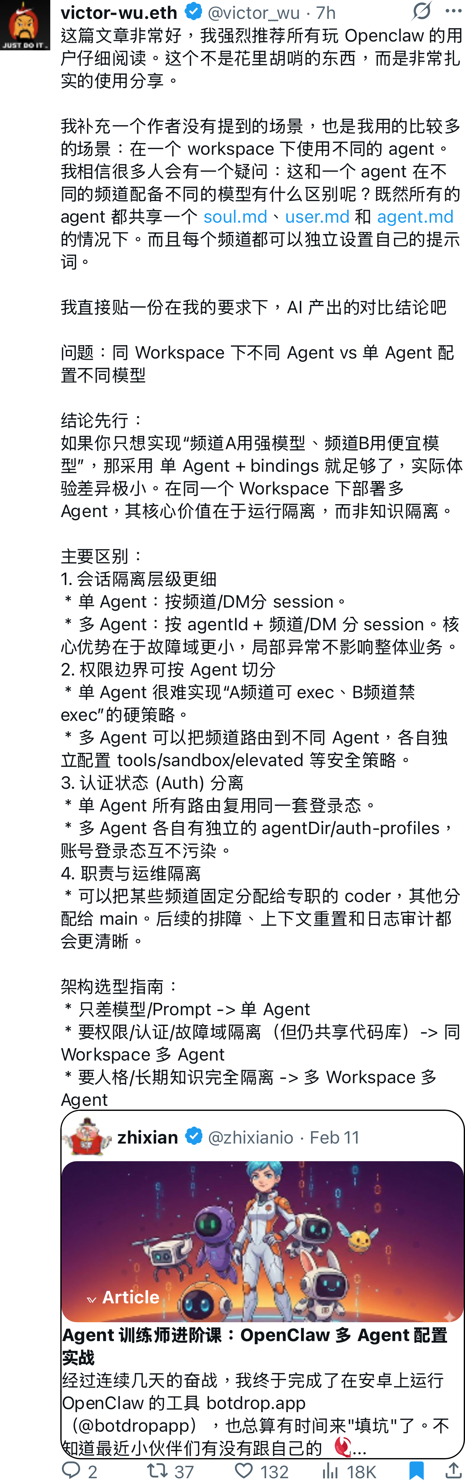 如果你只想实现“频道A用强模型、频道B用便宜模型”,那采用 单 Agent + bindings 就足够了,实际体验差异极小。在同一个 Workspace 下部署多 Agent,其核心价值在于运行隔离,而非知识隔离。