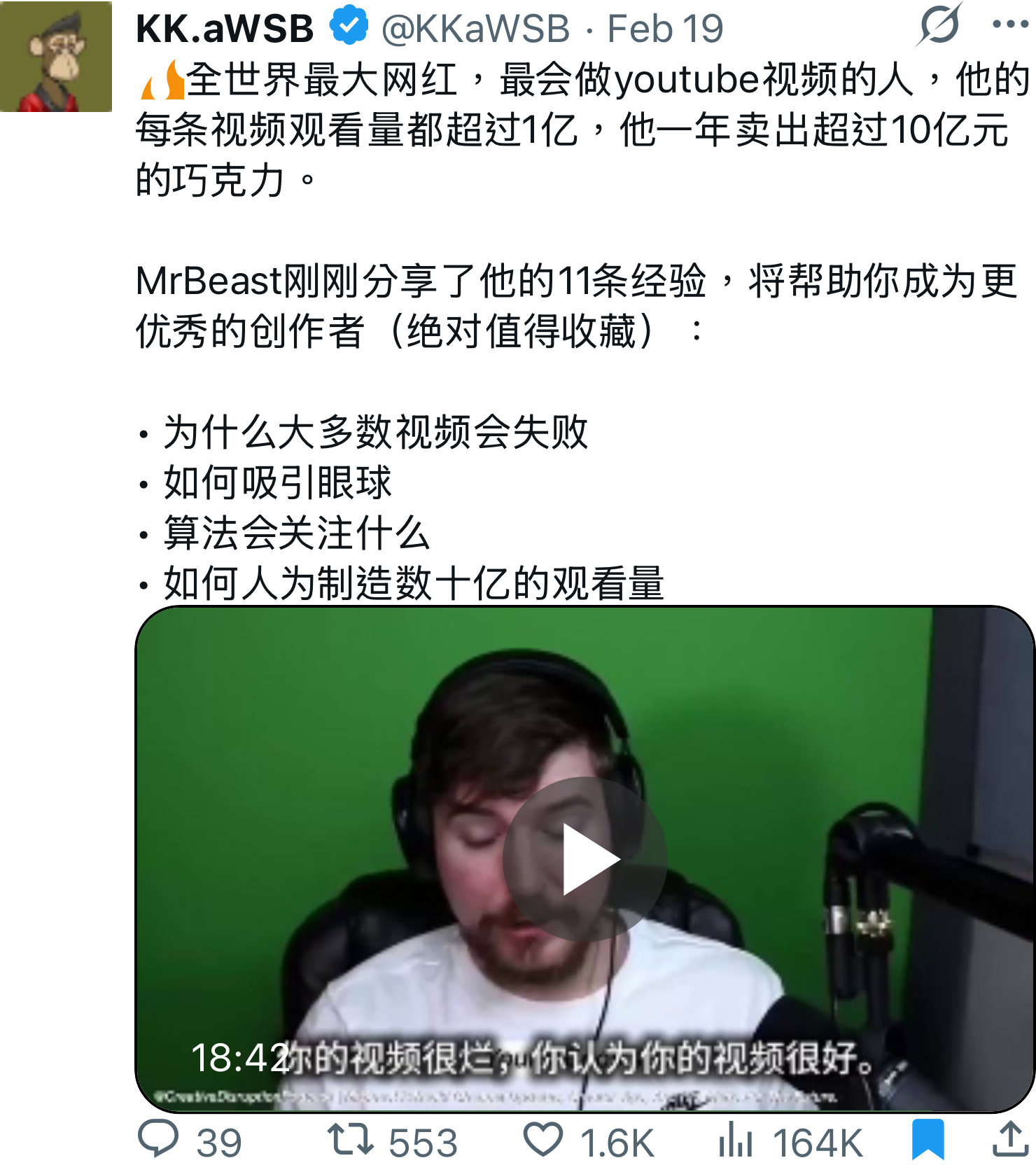 "text": "全世界最大网红,最会做youtube视频的人,他的每条视频观看量都超过1亿,他一年卖出超过10亿元的巧克力。\n\nMrBeast刚刚分享了他的11条经验,将帮助你成为更优秀的创作者(绝对值得收藏):\n\n• 为什么大多数视频会失败\n• 如何吸引眼球\n• 算法会关注什么\n• 如何人为制造数十亿的观看量",