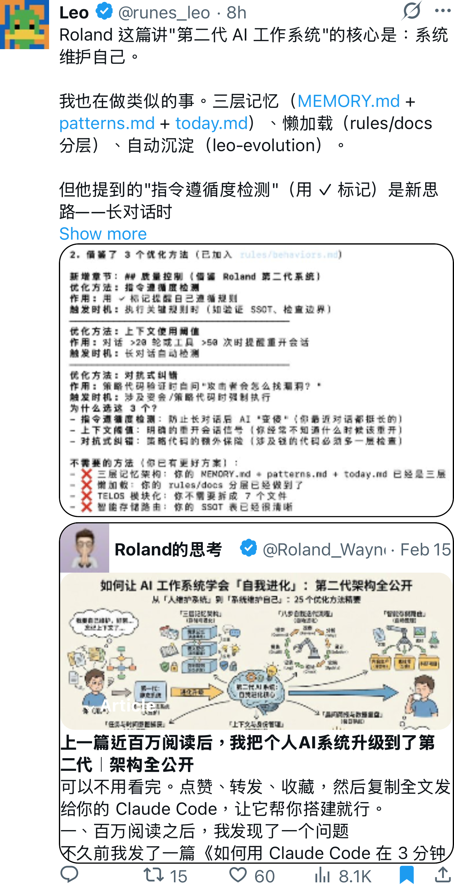 我也在做类似的事。三层记忆(http://MEMORY.md + http://patterns.md + http://today.md)、懒加载(rules/docs 分层)、自动沉淀(leo-evolution)。