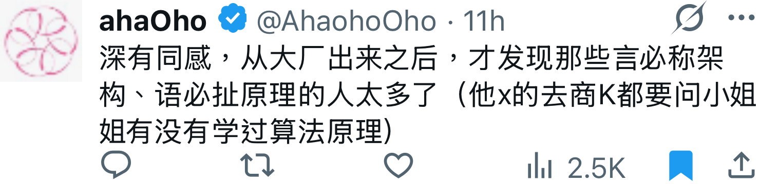 "title": "AhaohoOho: 深有同感,从大厂出来之后,才发现那些言必称架构、语必扯原理的人太多了(他x的去商K都要问小姐姐有没有学过算法原理)",