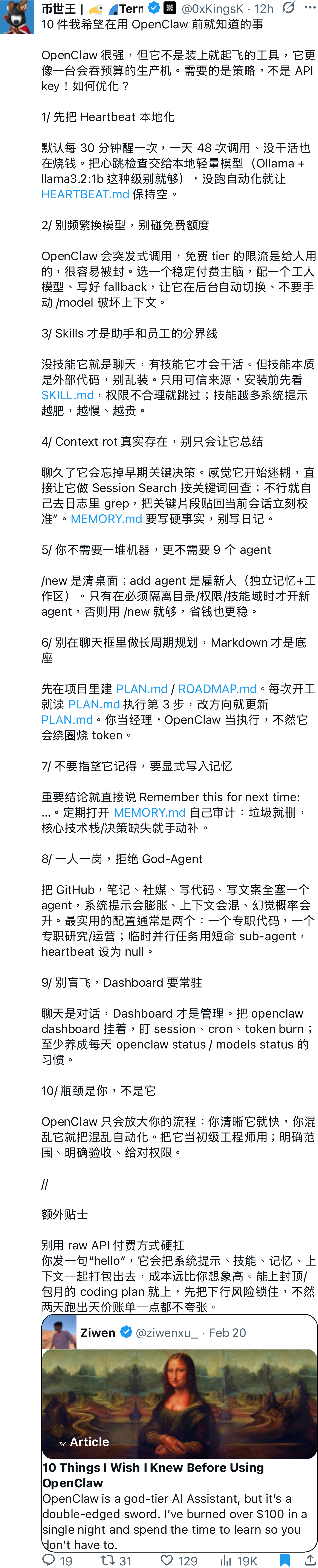 把 GitHub,笔记、社媒、写代码、写文案全塞一个 agent,系统提示会膨胀、上下文会混、幻觉概率会升。最实用的配置通常是两个:一个专职代码,一个专职研究/运营;临时并行任务用短命 sub-agent,heartbeat 设为 null。